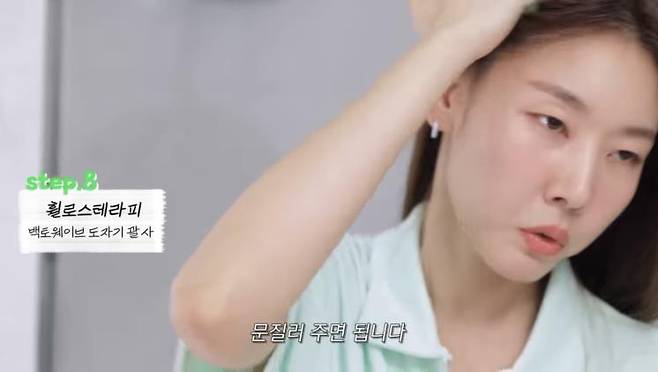 돌기가 촘촘한 괄사를 활용해 두피 마사지 역시 잊지 않는다. 위에서 아래로 내려가며 뒤통수까지 야무지게 문질러준다. 포인트는 측두근! 이곳을 집중적으로 마사지해 근육을 풀어주는데, 모근 강화는 물론이고 페이스 리프팅 효과까지 있다고 하니, 잊지 말고 충분히 마사지 해줄 것!
