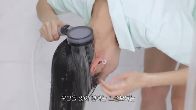 나는 샴푸를 할 때 어떤 자세로 할까? 한혜진은 허리를 숙이고 린스까지 마무리한다. 이유는 얼굴과 등에 샴푸가 닿아 트러블이 생기는 것을 예방하기 위해서라고. 트리트먼트를 헹궈낼 때는 두피까지 다시 헹궈준다는 느낌으로 꼼꼼히 씻어낸다.