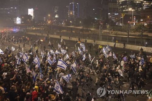 Israeli police disperse demonstrators blocking a highway during a protest against plans by Prime Minister Benjamin Netanyahu's government to overhaul the judicial system in Tel Aviv, Israel, Monday, March 27, 2023. Tens of thousands of Israelis have poured into the streets across the country in a spontaneous outburst of anger after Prime Minister Benjamin Netanyahu abruptly fired his defense minister for challenging the Israeli leader's judicial overhaul plan. (AP Photo/Oren Ziv)