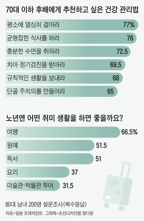 인생 후배들을 위한 건강 관리법에 대한 질문에는 ‘평소에 열심히 걸어라’라는 응답이 전체의 77%로 가장 많았다. 젊을 때부터 관리하면 좋을 신체 부위로는 응답자의 81%가 ‘치아’를 꼽았다. 그 다음 허리, 하반신, 눈, 머리(두발) 순이었다.