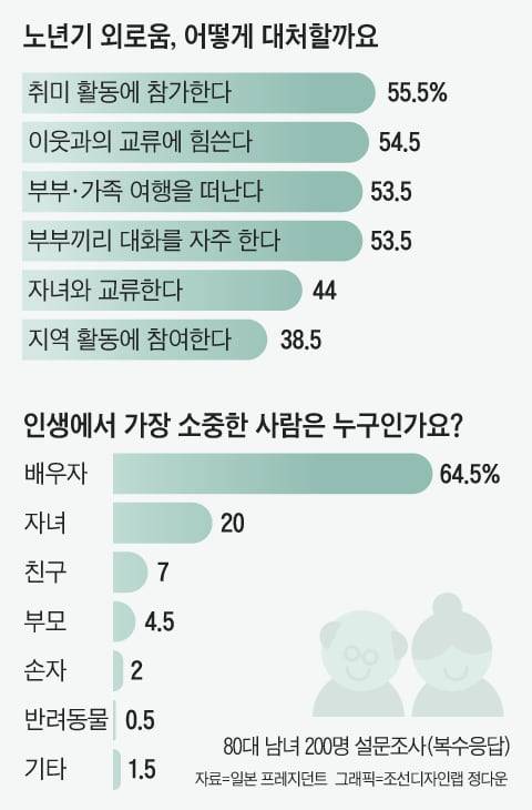 설문에 참여한 80대 선배들은 노년 고독을 이겨낼 구체적인 방법으로 ‘취미 활동에 참여한다’, ‘지역활동에 참여한다’, ‘부부 대화를 자주 한다’, ’부부·가족 여행을 떠난다’ 등을 추천했다. ‘늙으면 부부 밖에 없다’는 말이 있다더니, 설문에 참여한 80대 응답자 10명 중 7명은 ‘인생에서 소중히 생각했어야 할 사람은 누구인가’라는 질문에 ‘배우자’라고 답했다.