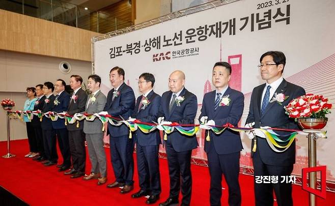 27일 서울 강서구 김포국제공항 국제선에서 열린 '김포-북경,상해 노선 운항재개 기념식'에 참석한 주요 내빈들이 테이프커팅을 하고 있다.