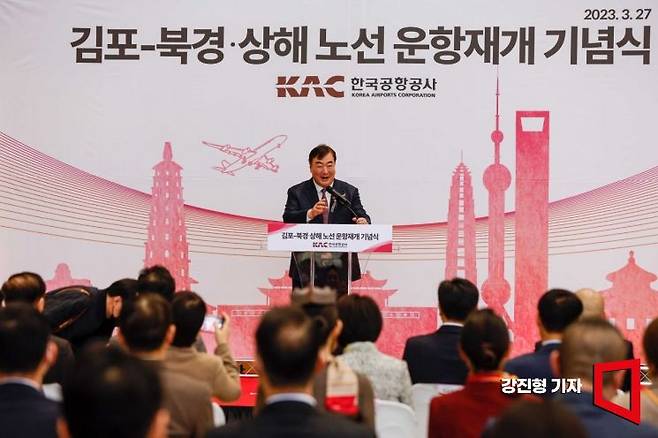 싱 하이 밍 주한중국대사가 27일 서울 강서구 김포국제공항 국제선에서 열린 '김포-북경,상해 노선 운항재개 기념식'에 참석해 축사하고 있다.
