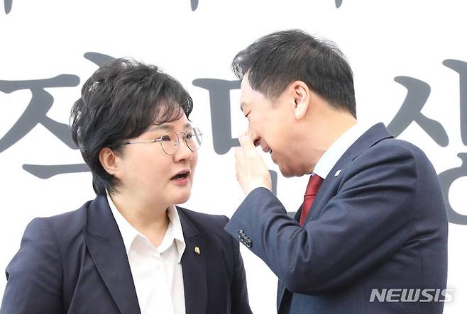 [서울=뉴시스] 전진환 기자 = 국민의힘 김기현 대표와 조수진 최고위원이 27일 오전 서울 여의도 국회에서 열린 최고위원회의를 마치고 대화하고 있다. 2023.03.27. amin2@newsis.com