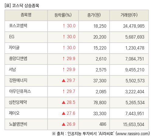 [fnRASSI]장마감, 코스닥 상승 종목(포스코엠텍 30.0% ↑)