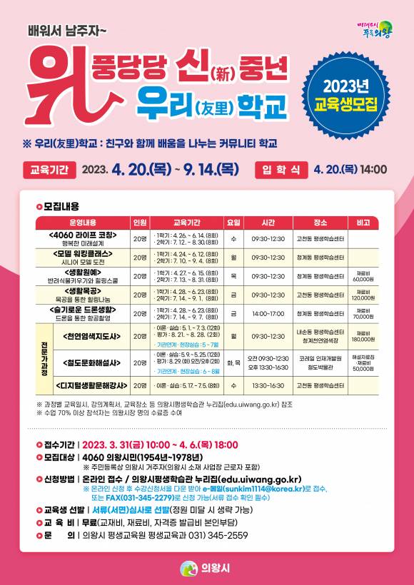 의왕시(시장 김성제)는 오는 4월 20일부터 운영하는 '2023년 위풍당당 신(新)중년 우리(友里)학교'교육생을 모집한다고 27일 밝혔다.
