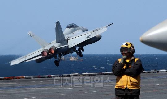 한미 해군 연합 해상훈련이 열린 27일 제주 남쪽 공해상에 진입한 미 핵추진 항공모함 '니미츠'(CVN 68·10만t급)에서 F/A-18F 슈퍼호넷 이함 훈련이 진행되고 있다.