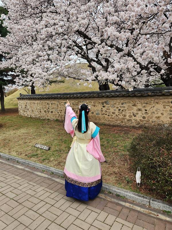 | ▲ 화사한 벚나무를 가리키며 신라한복을 입고 사진 촬영 중인 방문객 모습(2023.3.25) |