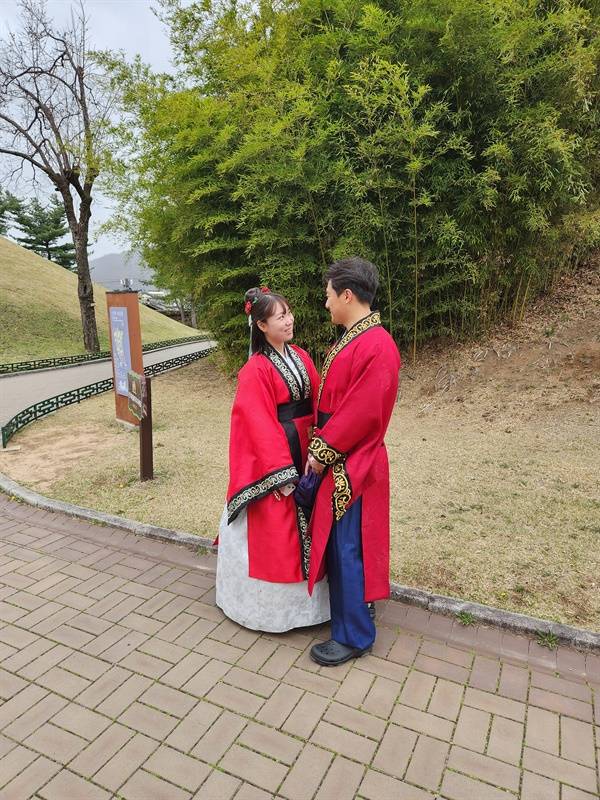 | ▲ 붉은색 신라한복을 입고 대릉원 대나무숲 앞에서 사진 촬영 중인 한 쌍의 커플 모습(2023.3.25) |