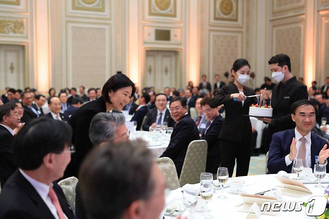 (서울=뉴스1) 오대일 기자 = 오영주 주베트남 대사가 27일 오후 청와대 영빈관에서 열린 2023년도 재외공관장 초청 만찬에서 생일 축하케이크를 받고 있다. (대통령실 제공) 2023.3.27/뉴스1