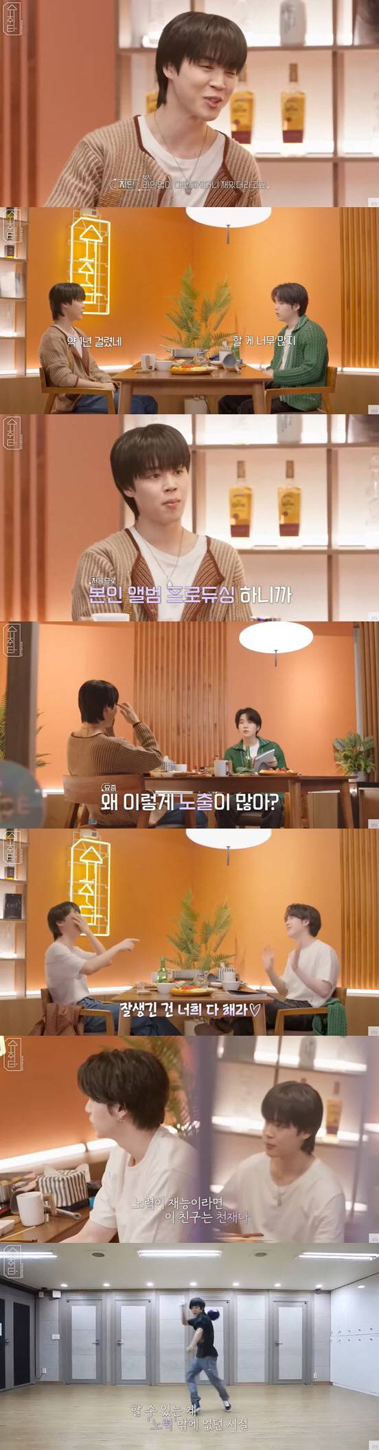 또한 지민과 앨범 및 곡 작업에 대해 이야기를 나누던 슈가는 "인간 박지민에 대해서 얘기를 나눠보자"고 말했다. 슈가는 "너의 첫 상경 날부터 지금까지 쭉 봐왔던 사람으로서 '노력이 재능이라면 이 친구는 천재다'라고 생각할 정도로 노력을 많이 해왔던 멤버라고 생각한다. 요새도 매일 같이 연습하지 않느냐"고 물었다.