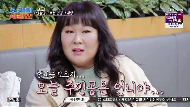 [TV리포트=이지민 기자] 27일 TV CHOSUN 예능 프로그램 '조선의 사랑꾼'에서는 오나미가 절친 김민경에게 남편의 지인을 소개해 주는 모습이 전파를 탔다.