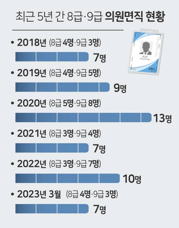 27일 본지 취재 결과, 올해 3월 기준 의원면직한 8급·9급 춘천시 공무원은 모두 7명(8급 4명·9급 3명)으로 집계됐다. 이는 지난해 의원면직한 8급·9급 직원 규모(10명)의 70%에 달한다. 최근 5년간 의원면직한 8급·9급 직원 수는 평균 7명~10명선이다. 2018년 7명에서 2019년 9명, 2020년 13명으로 증가한 이후 2021년 7명, 2022년 10명으로 집계됐다.