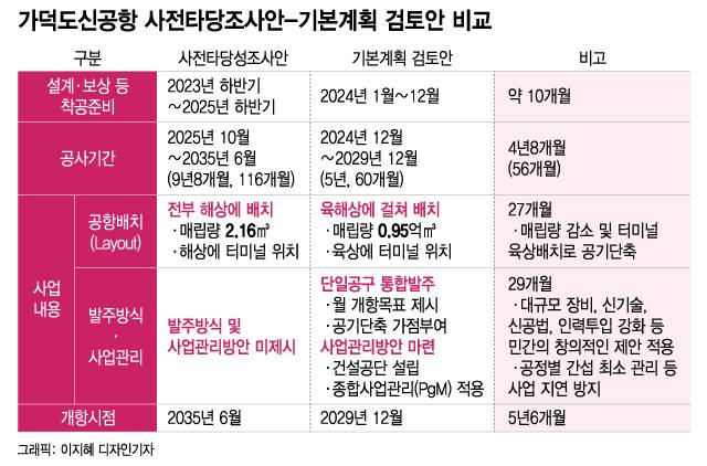 국토부는 앞서 2029년 12월 공항 개항을 목표로 한 가덕도신공항 건설사업 추진 계획안을 발표했다. 전체 공사기간을 5년으로 설정, 공사기간을 앞당기기 위해 공항배치 계획을 바다 위 완전 해상공항에서 육·해상 공항으로 수정했다.