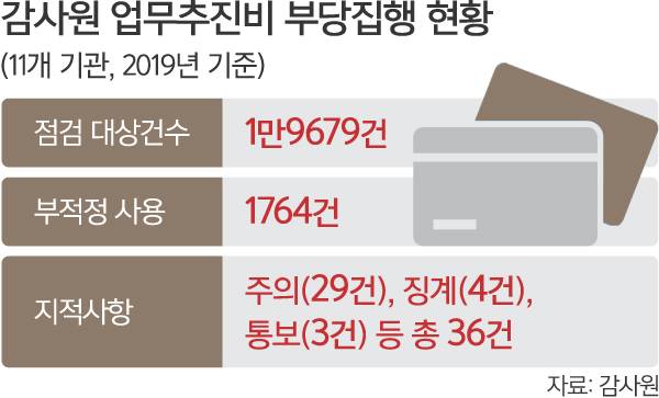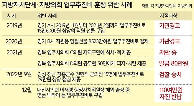 지방의회뿐 아니라 자치단체의 업무추진비 부적정 사용도 다수 포착됐다. 경기도의 한 기초단체는 직원 생일선물과 상품권 등을 업무추진비로 구입했다. 다른 기초단체는 2020년 명절 선물로 8600여만원어치의 상품권과 선물세트를 구입했다. 민선 7기 전 용산구청장은 업무추진비를 휴일에 사용할 수 없는데도 모두 19차례 휴일에 썼다. 전 강북구청장과 전 서대문구청장도 각각 13차례, 12차례 확인됐다. 경기지역 기초단체는 지난해 업무추진비로 명절이나 선물 등을 구입해 직원들에게 지급했다가 감사에 걸렸다.