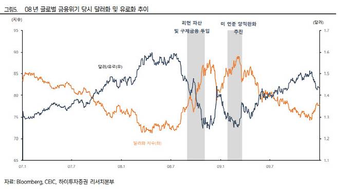박 연구원은 “글로벌 자금이 아직은 신용위기 확산에 따른 극도의 안전자산 선호보다는 미 연준의 금리인상 사이클 중단에 따른 신용위기 완화에 무게를 두고 있는 것”이라며 “과거 글로벌 금융위기 당시를 되돌아보면 리먼 파산 등 신용위험이 고조되는 국면에서는 달러화 강세 현상이 나타났지만 미 연준의 유동성 확대 정책이 추진되면서 달러화가 약세 전환됐음을 상기해볼 필요가 있다”고 전했다.