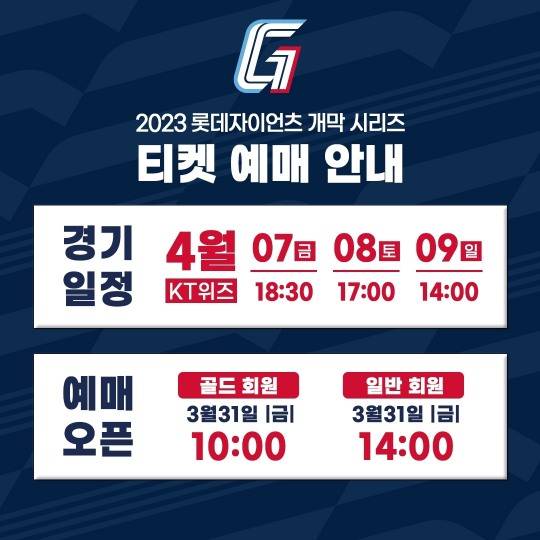 롯데자이언츠는 4월 7일(금) ~ 9일(일) 열리는 2023 시즌 kt 위즈와의 사직 홈 개막 시리즈 입장권 예매를 오는 31일(금) 오후 2시부터 시작한다.