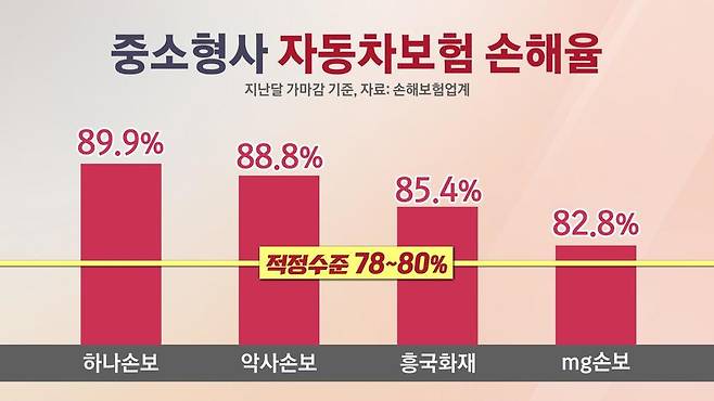 28일 손해보험업계에 따르면 지난달 중소형사의 자동차보험 손해율은 하나손해보험이 89.9%, 악사손해보험이 88.8%, 흥국화재가 85.4%, MG손해보험이 82.8% 등으로 나타났습니다. 대형 손보사 빅4(삼성화재, 현대해상, KB손보, DB손보)가 지난달 자동차보험 평균 손해율이 77.2%를 기록한 것과는 대조적입니다.