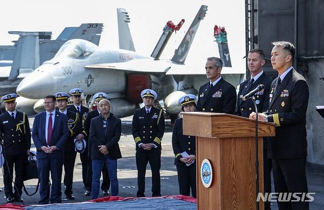 [부산=뉴시스] 사진공동취재단 = 28일 부산 작전기지에 입항한 미국 핵 추진 항공모함 니미츠(CVN-68) 갑판에서 한미 기자회견이 진행되고 있다. 2023.03.28. photo@newsis.com