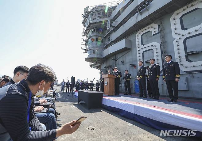 [부산=뉴시스] 사진공동취재단 = 28일 부산 작전기지에 입항한 미국 핵 추진 항공모함 니미츠(CVN-68) 갑판에서 한미 기자회견이 진행되고 있다. 2023.03.28. photo@newsis.com