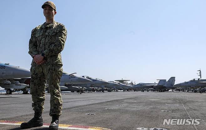 [부산=뉴시스] 사진공동취재단 = 28일 부산 작전기지에 입항한 미국 핵 추진 항공모함 니미츠(CVN-68) 갑판에 F/A-18 전투공격기를 비롯한 항공기들이 서 있다. 2023.03.28. photo@newsis.com