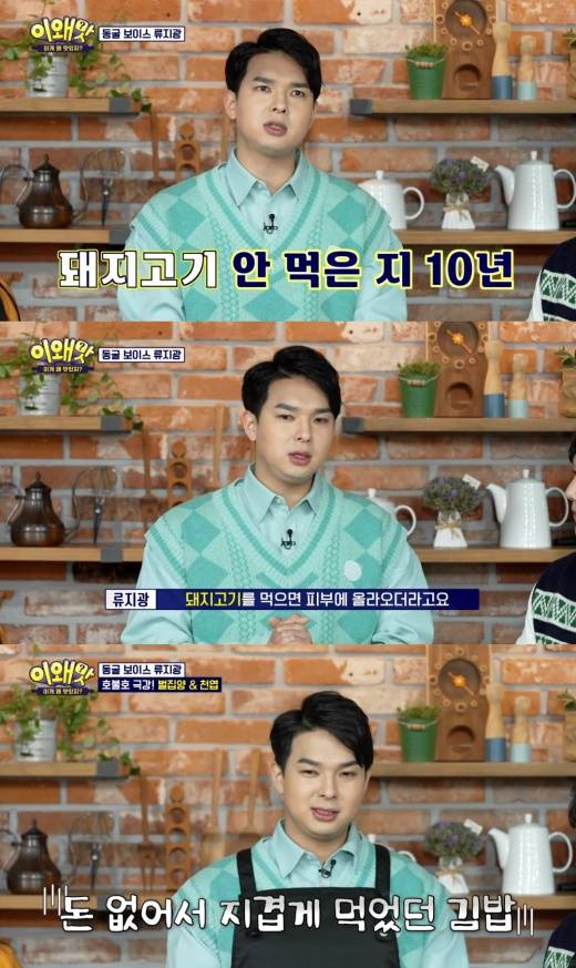 류지광은 편식이나 못 먹는 음식이 있냐는 '이왜맛' 공식 질문에 "돼지고기를 먹는데 피부 트러블이 생기더라. 그것 때문에 스트레스를 받아서 끊은지 10년 됐다"고 말했다. 이어 "삼겹살, 소시지, 돈까스를 안 먹는다. 이제는 돼지고기 맛이 기억이 안난다"고 덧붙였다.