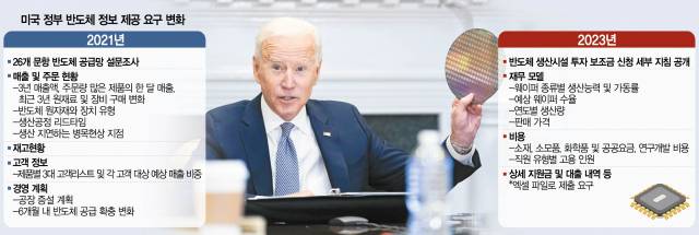 미국 정부가 27일(현지 시간) 한국·대만 등 반도체 기업에 반도체 보조금을 주는 조건으로 반도체 원재료와 수율(생산품 중 양품의 비율), 가격 등의 정보까지 요구하자 삼성전자(005930)와 SK하이닉스(000660) 등 국내 반도체 업체는 당혹스럽다는 반응을 보이고 있다. 이런 정보가 고스란히 공개되면 고객사와 가격 협상이 어려워질뿐더러 최악의 경우 기밀 정보가 미국 경쟁사에 흘러들어가는 최악의 시나리오도 배제할 수 없어서다.