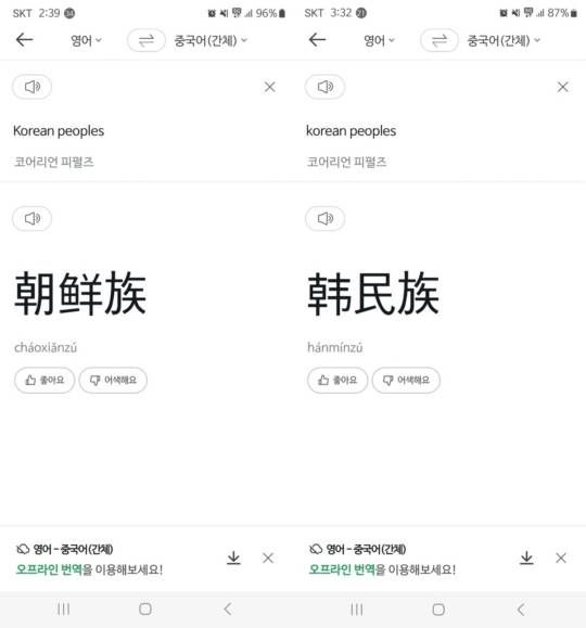 이들 번역기에서는 중국어 간체·번체 번역도 '한민족'으로 나온다.
