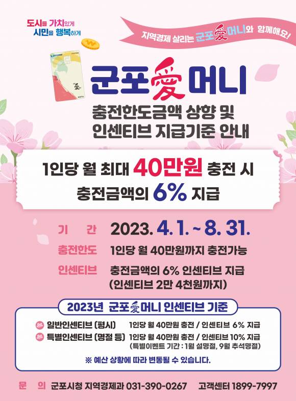 군포시가 지역화폐 군포愛머니 월 충전한도를 오는 4월 1일부터 확대한다고 밝혔다.