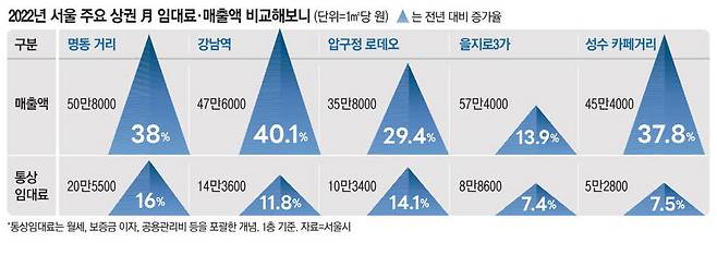 코로나19로 위축된 서울 주요 상권이 다시 꿈틀거리고 있다. 지난해부터 차근차근 이어져온 사회적 거리 두기 해제, 마스크 착용 의무 완화, 외국인 관광객 유입 등이 온기를 불어넣고 있다. 상가 공실률은 줄어들고 임대료는 오르고 있다. 다만 코로나 이후 바뀐 소비 패턴에 상권도 '양극화' 현상을 보이고 있다.