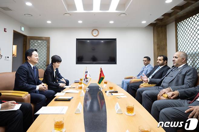 (서울=뉴스1) = 원희룡 국토부 장관이 28일 국토발전전시관에서 방한 중인 칼판 알-슈에일리(Khalfan Al-Sueili) 오만 주택도시계획부 장관을 만나 대화하고 있다. (국토교통부 제공) 2023.3.28/뉴스1