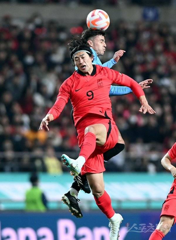 28일 서울 마포구 서울월드컵경기장에서 한국과 우루과이의 축구대표팀 평가전에서 한국 조규성이 우루과이 선수와 공중볼을 다투고 있다.