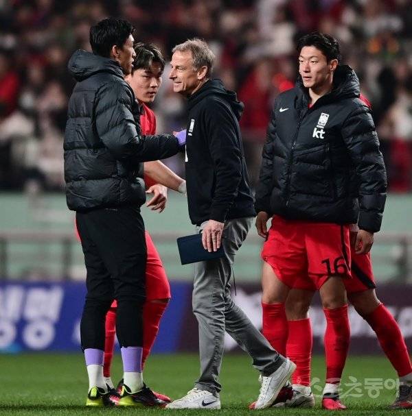 28일 서울월드컵경기장에서 열린 한국과 우루과이의 평가전 경기에서 1-2로 패한 한국 클린스만 감독이 선수들을 격려하고 있다.