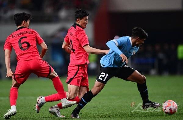 28일 서울월드컵경기장에서 열린 한국과 우루과이의 평가전 경기에서 한국 김민재가 우루과이 공격수를 수비하고 있다.