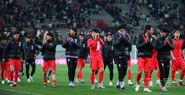 28일 서울월드컵경기장에서 열린 한국과 우루과이의 평가전 경기에서 1-2로 패한 한국 선수들이 관중들에게 인사하고 있다.