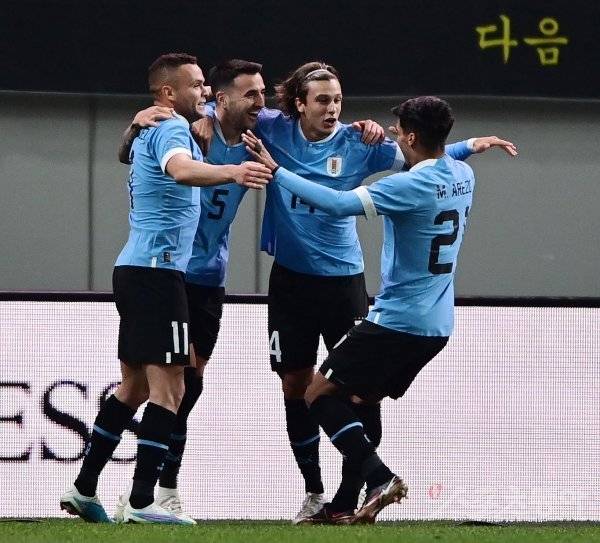 28일 서울월드컵경기장에서 열린 한국과 우루과이의 평가전 경기에서 우루과이 베시노(왼쪽 두 번째)가 두 번째 골을 성공시킨 후 동료들과 기뻐하고 있다.