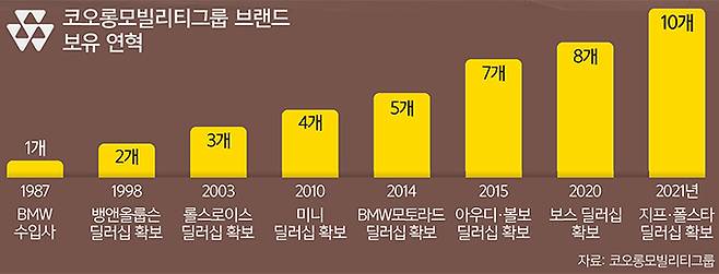 코오롱그룹의 수입차 사업은 1987년 코오롱 상사에서 출발했다. 당시 수입차 시장이 처음 개방되면서 코오롱 상사가 BMW와 수입 계약을 체결하고 영업을 시작했다. 이후 미니(MINI), 롤스로이스, 이륜차인 BMW 모토라드 딜러십(판매허가권)을 차례로 확보해 사업을 성장시키며 대형 딜러사로서의 입지를 다졌다.