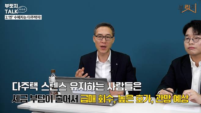 전반적으로 이번 공시가격이 하락, 공동주택 가격의 전년도 대비해서 굉장히 큰 폭으로 하락한 것뿐만 아니라 전년도에 세법 개정하게 되면서 올해 적용되는 종부세 쪽의 세율에서 세율이 인하된 부분이 있습니다. 그리고 1주택자뿐만 아니라 다주택자에 대해서도 기본적으로 종부세를 계산할 때 차감해주는 금액, 공제금액이라고 하는데요. 이 공제금액이 또 상향된 부분 기준이 높아졌습니다. 그러니까 빼주는 금액이 커지고 세율이 줄어들었기 때문에 이번에 공시가격이 하락한 것까지 더해서 굉장히 큰 폭으로 하락을 하게 된 것이고요. 자료 보시면 우선 고가 주택 같은 경우에 상대적으로 좀 하락 폭이 클 수 있는데요. 예를 들어서 강남에 있는 한 서초에 있는 한 아파트 같은 경우에 전용 112㎡를 기준으로 해서 작년에 2570만원 정도 1주택자 기준으로 지금 말씀드린 금액은 재산세와 종부세를 합친 금액입니다. 그러니까 공시가격이 이제 변동되게 되면 그에 따라서 재산세도 변동이 되고, 그다음에 마찬가지로 종부세도 같이 변동되고요.