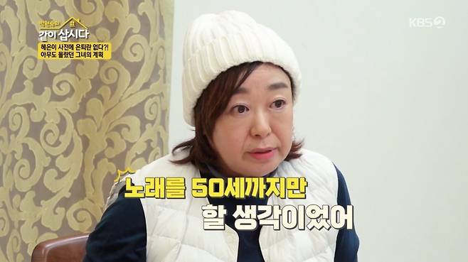 또 혜은이는 50세까지만 노래하고 싶었지만 형편이 좋지 않아 그 기간을 5년씩 늘리다 보니 거의 20년이 지났다고 설명했다. 혜은이는 "앞으로 5년만 열심히 하고 싶다"고 했고, 박원숙은 "돌아가실 때까지 해라"는 말로 그 선택을 말렸다.