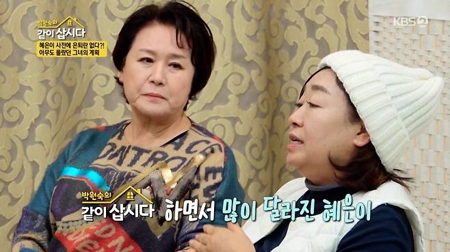 혜은이는 "'같이 삽시다' 하면서 내가 너무 많이 달라졌다"며 "긍정적인 마인드가 더 긍정적으로 바뀌니까 '아 내가 조금만 더 일찍 이렇게 할 수 있었으면 좋았을 텐데' 싶었다"고 밝혔다. 이어 "나는 고모(박원숙)를 보면서 '고모는 진짜 세월이 지날수록 더 멋있는 사람이 되네'를 생각한다. 그래서 나도 이제는 언제까지 한다는 생각을 버리고 내가 하고 싶을 때까지 일을 하고 싶다"고 말했다.