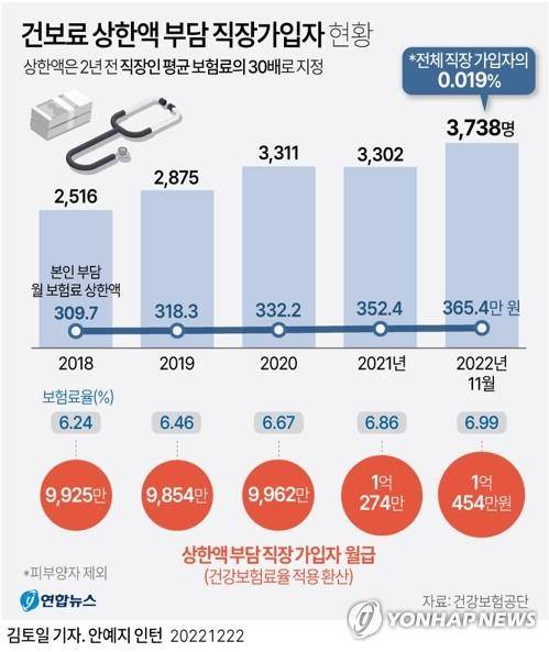 2018년 월 619만3천140원, 2019년 636만5천520원, 2020년 664만4천340원, 2021년 704만7천900원 등으로 올랐고, 2023년 적용되는 상한액은 782만2천560원으로 2022년(730만7천100원)보다 51만5천460원이 인상됐다.