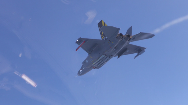 국산 초음속 전투기 KF-21 ‘보라매’가 비행 중 무장을 기체에서 분리하고, 기총을 발사하는 시험을 각각 성공했다.
