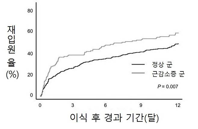 수술 후 1개월, 3개월, 12개월 안에 재입원하는 사례를 확인했을 때, 정상 군은 각 16.8%, 26.6%, 48.2%였지만 근감소증 군은 각 28.3%, 38.8%, 58.6%로 더 높았다. 특히 1개월 안에 재입원하는 경우 근감소증 군에서 약 1.7배 정도 높았다.
