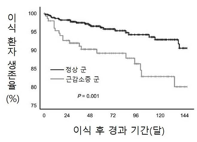 세브란스병원 이식외과 김현정, 이주한, 허규하 교수 연구팀은 신장이식 환자가 근감소증을 동반하면 사망률이 근감소증이 없는 신장이식 환자보다 최대 2.4배 높다고 29일 밝혔다.
