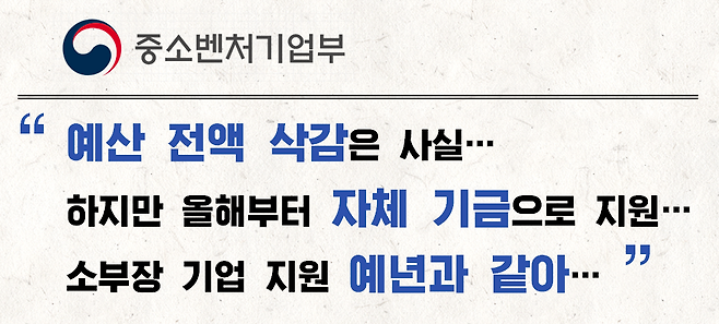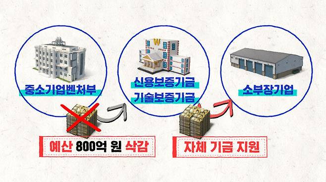중소벤처기업부에 경위를 물었습니다. 중소벤처기업부는 "소부장 기업 지원은 어차피 계속 유지해야 할 제도니, (신용보증기금과 기술보증기금의) 자체 기금으로 하겠다고 국회에 보고했고, 그렇게 빼는 걸로 정리됐다"고 말했습니다. 결과적으로, 어디 예산으로 지원할 것이냐 문제일 뿐, 소부장 기업 지원 자체는 달라지는 게 없기 때문이라는 겁니다.