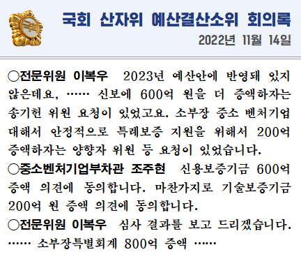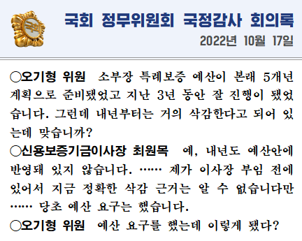 사실은팀이 예산안 논의 당시 회의록을 살펴봤습니다. 신용보증기금과 기술보증기금 출자 예산 800억 원이 삭감된 부분은 지난해 10월 국정 감사 때부터 말이 나왔습니다. 정부가 예산안을 국회에 보내면서 이 부분을 반영하지 않았기 때문입니다. 야당의 문제 제기가 있었지만, 정부는 제대로 설명하지 못했습니다.