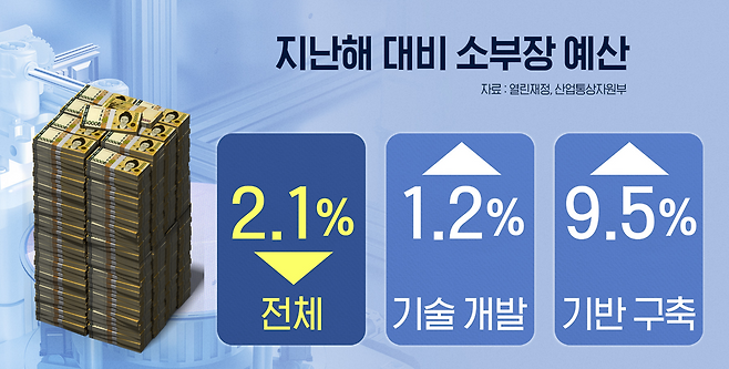 오히려 기술 개발과 기반 구축 분야의 올해 예산은 지난해 대비 각각 1.2%(1조 8,436억 원에서 1조 8,657억 원), 9.5%(4,058억 원에서 4,443억 원) 증가한 것으로 분석됐습니다.
