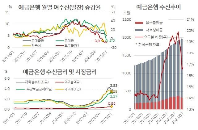시장형 상품의 매력이 커지면서 상대적으로 이자율이 높은 저축성 예금의 인기도 꺾이기 시작합니다. 지난해 11월 전년 동기 대비 11% 넘던 저축성 예금의 전년 동기 대비 증가율은 올 1월 5.8%로 뚝 떨어집니다. 총예금 증가율도 올 1월 3%로, 2014년 1월 이후 9년 만에 가장 낮은 수준을 기록합니다. 최근 자금시장 상황을 고려하면 2월 이후 총예금이 전년 대비 줄었을 가능성이 큽니다. 총예금이 전년 동기 대비 줄어든다면 신용카드 사태 후유증이 영향을 미쳤던 2004년 11월부터 2005년 4월 이후 약 18년 만에 처음이 됩니다.