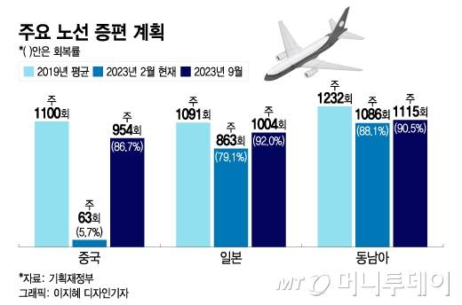 예컨대 코로나19 이전인 2019년 평균 주 1100회 운항했던 대중국 노선의 경우 올해 9월까지 주 954회(회복률 86.7%)까지 늘릴 계획이다. 같은 기간 일본은 92%(주 1004회), 동남아 90.5%(주 1115회)까지 회복률을 높인다는 목표다.