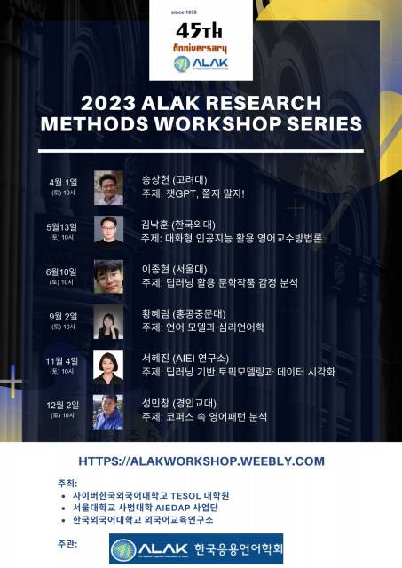 사이버한국외국어대학교 TESOL대학원(원장 이선영)은 한국응용언어학회와 '2023 연구방법론 워크숍 시리즈(2023 ALAK Research Method Workshop Series)'를 개최한다.